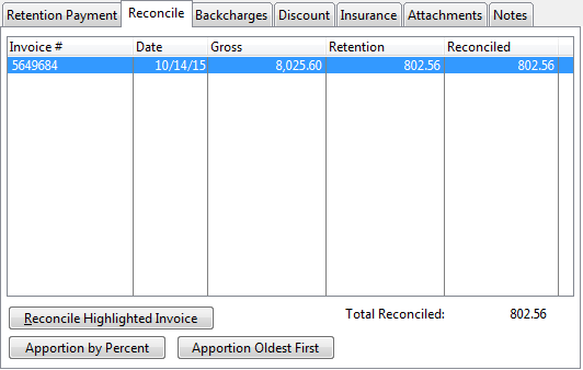 Manually reconcile the Retention To be Paid amount to one or more invoices by highlighting the desired Invoice and press the Reconcile Highlighted Invoice button. It is now possible to edit the Reconciled column. Enter in the desired information and press the Enter key.