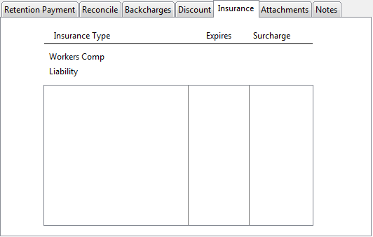 When a subcontractor is working on a job, he is required to carry insurance. Sometimes, however, a subcontractor will not have insurance or his insurance will have expired. In these cases, the general contractor is required to pay the insurance. When this happens, the general contractor usually charges the insurance back to the subcontractor via a backcharge. Enter the Amount to be charged and applied to this account. If Insurance is expired, this field will automatically be filled in.
