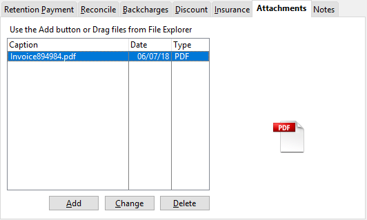 Press the Attach tab and the following screen comes into view. This tab allows the user to attach outside files to the invoice. For example: a scanned copy of a letter received regarding the Invoice a can be attached.
