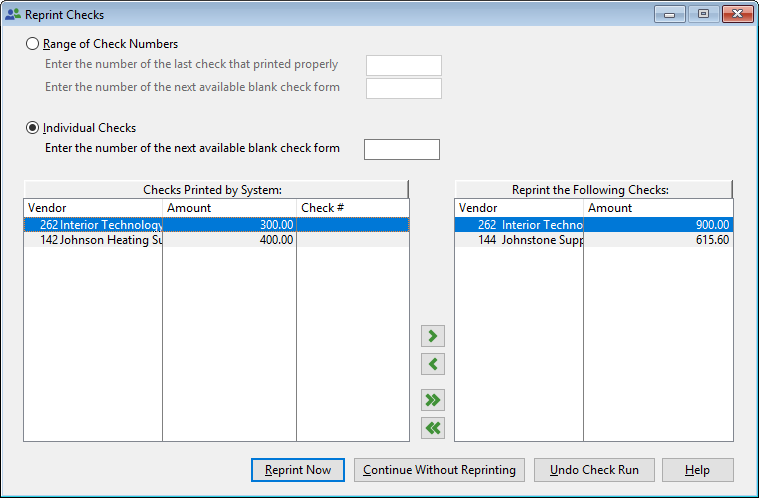 This allows for reprinting of individual checks or selected groups of checks. The checks which have been printed are listed in the Checks Printed by System box. Use the arrow buttons to move the desired checks to the Reprint the Following Checks box.