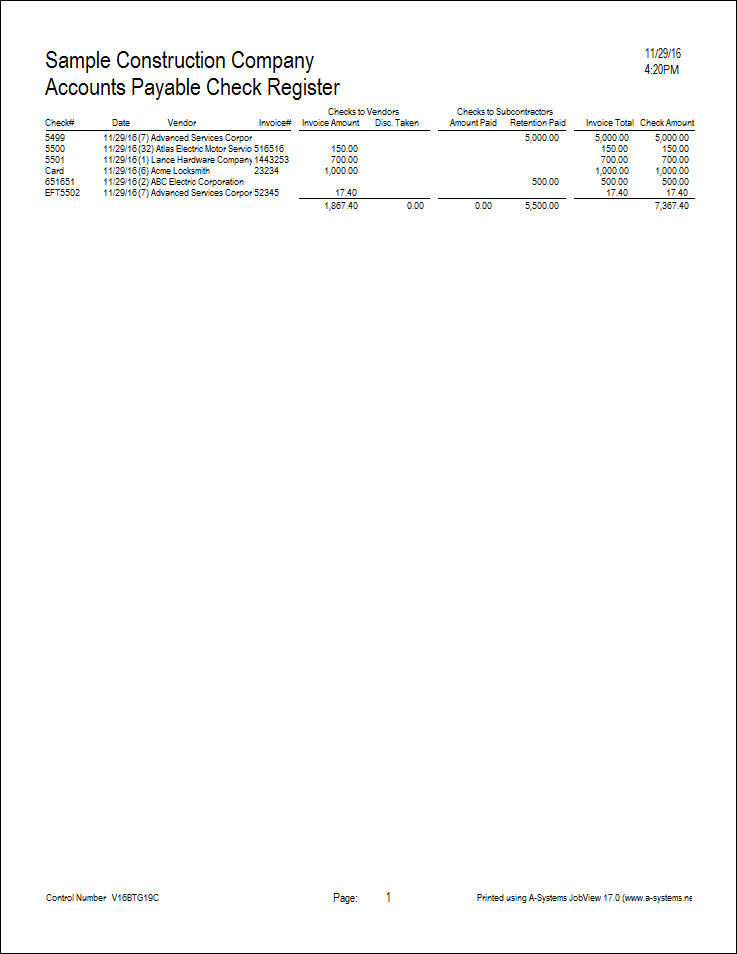 The Accounts Payable Check Register Report is a listing of the checks in the Accounts Payable Check Register File. The report heading includes the report title, date, company name and page number.