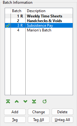 Batches can also be sorted by Batch Number or by Batch Description by clicking on the column heading word "Batch" or "Description." This is a temporary sort order that will not be remembered when the window is closed.