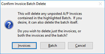 This option will delete any unposted transactions in the highlighted Batch. The Batch itself may also be deleted if desired. To Delete the Batch and/or the transactions in the Batch, highlight the Batch and press the Delete button. For more information, see Delete a Batch.