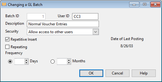 Repeating batches are special. In a normal batch, when the batch is posted, all the items in the batch are removed so the batch can be reused at a later date. In a Repeating batch, when the batch is posted, the items in the batch remain (perhaps with their dates being automatically changed) so they can be posted again at a later time. Repeating batches are useful for any type of repeating transactions, including loan payment invoices in Accounts Payable, salary invoices in Payroll, or depreciation entries in General Ledger.