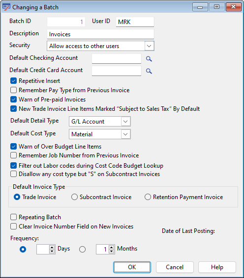 Select the type of invoice that will most frequently be entered into this Batch. Choose from Trade Invoice, Progress Billing, or T&M Billing. If the Batch is defined as a T&M Billing batch, all trade invoices inserted into that batch will require a Job Number. If a Trade Invoice is entered in the batch without a Job Number, the user will receive a warning that the Invoice is missing the Job Number.