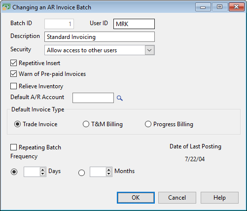 Indicate whether this is a repeating Batch. Transactions, timesheets and invoices contained in a repeating Batch will not be removed from the Batch when it is posted. If this box is checked, the next field will be activated. A repeating Batch is one that will repeat on a weekly or monthly basis. Note: The repeating Batch is not used to enter multiple invoices. It is used so that the same invoice(s) will remain in the Batch and be available for use multiple times.