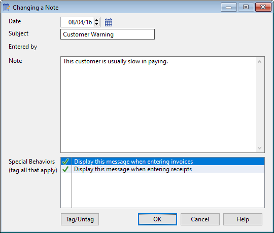 If this is a note attached to a Vendor, Customer, Employee or Job record, a list of speical behaviors will appear. Tag any desired behaviors. For example, if this is a Customer note, you may select to have the system display this note every time a user attempts to enter an invoice for this customer. If a note is entered like the one above, the following window will pop up when this customer is selected during invoice entry: