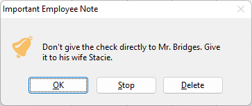 On this note display window , the user has more options. Clicking “OK” will close the note window. Clicking “Stop” will turn off the special behavior for this note, meaning it will no longer pop up during timesheet entry. Clicking “Delete” will remove the note from the employee record all together.