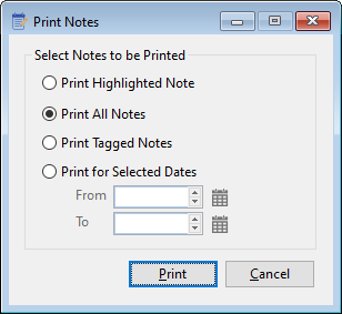 Using this window the operator can print just the note highlighted in the list box, all the notes in the list box, the notes tagged in the list box, or all notes that fall within the entered date range.