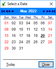 Located next to the date field is a calendar icon. In order to use the calendar to look up a date, click on the calendar button or press the F2 key on the keyboard. A calendar like this will appear: