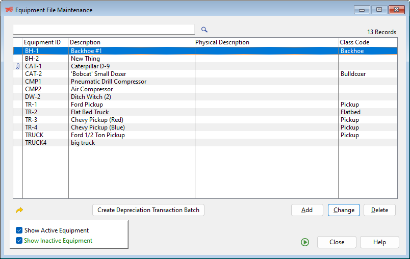 Click this button to create a batch of GL Transactions to depreciate the value of equipment. See Fixed Assets for more information.