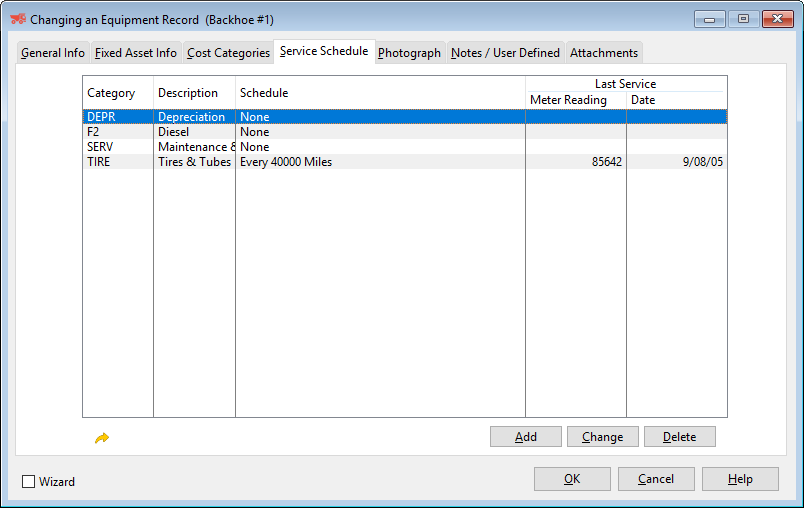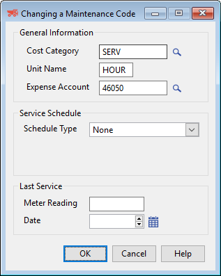 The user can enter service schedule information for each cost category attached to a piece of equipment. This information, combined with information recorded during cost postings, helps the computer determine when the service should next be performed.