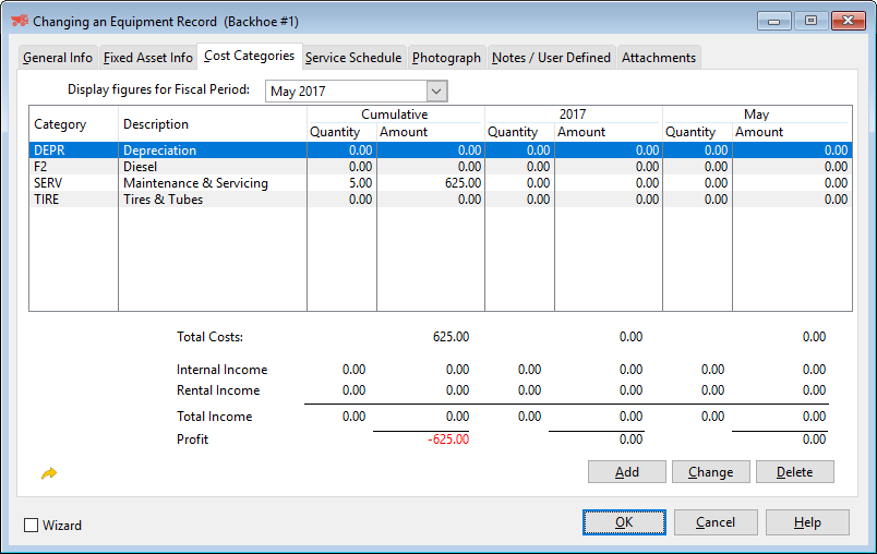 Once a piece of equipment has been setup, cost categories may be attached for tracking expenses against the piece of equipment. Press the Cost Categories tab and the following screen comes into view.