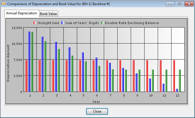 This tab displays the Book Value of the asset over its expected life according to each Depreciation Method.