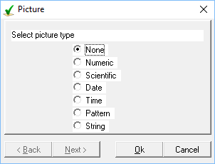Picture: Define how the variable will be printed on the report by using the Picture dialogue box.