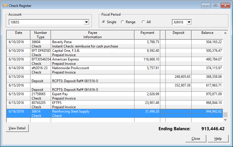 This window shows all the transactions to the selected checking accouint for the range of fiscal periods selected. It also shows the ending account balance as of the end of the selected fiscal period range. If the window is accessed from the Enter General Ledger Accounts browse window, the account number will already be selected, and the fiscal period range will be the Current Fiscal Period.