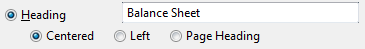 This type of line item simply prints text on the financial statement. A Heading can be specified as Left Justified, Centered, or a Page Heading. A Page Heading is simply a Centered Heading that will force the printer to start on a new page. Select Centered as the page heading for the first page of the Balance Sheet, not Page Heading. Page Heading is for the 2nd, 3rd, 4th pages, etc.
