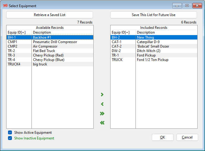 All Included Equipment IDs are listed in these columns. Use the arrows to move selected records or all records between the Available and Included areas.