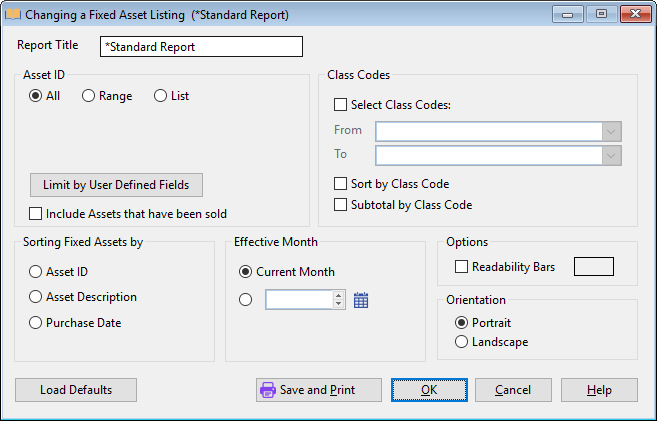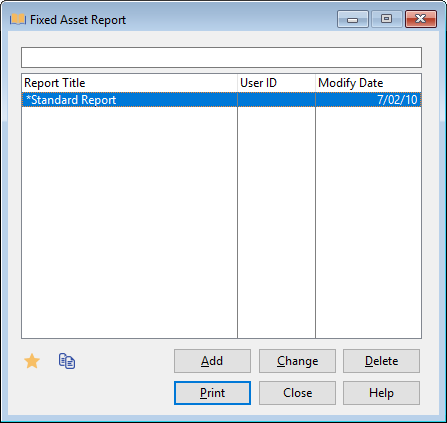 Press the Add or Change button to add a or modify a Fixed Asset Report and the following screen will come into view.