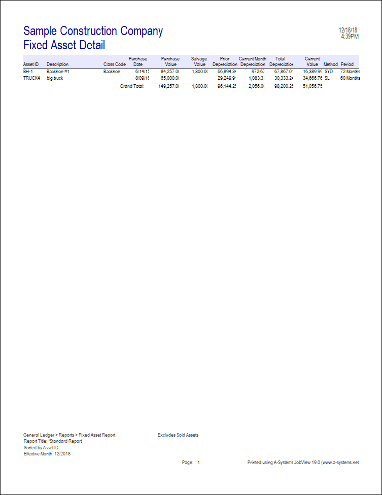 Totals for Purchase Value, Salvage Value, Prior Depreciation, Current Depreciation, and Current Value will be displayed.