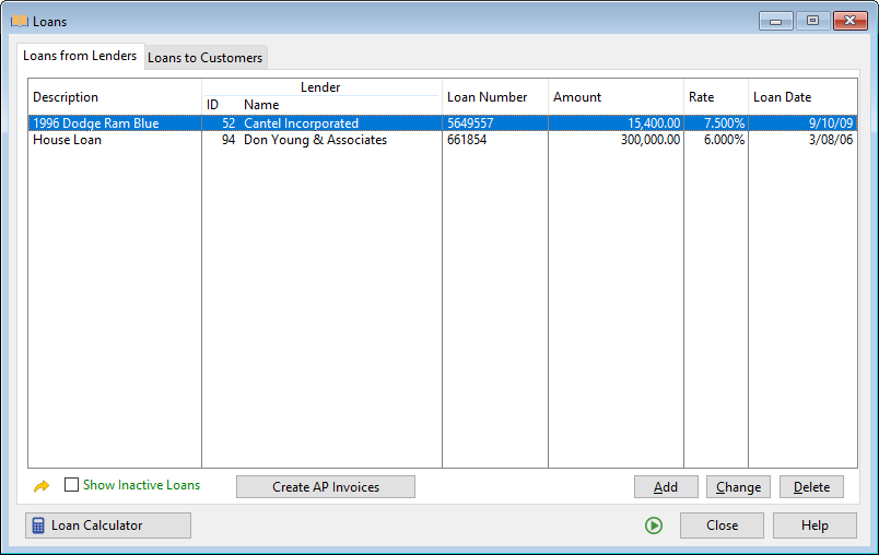 The two tabs separate the types of loans tracked by this module: Loans from Lenders and Loans to Customers.