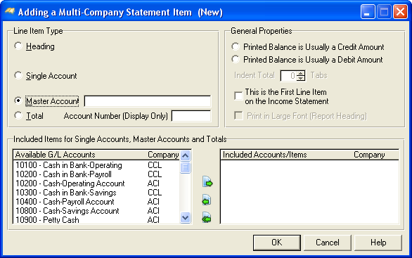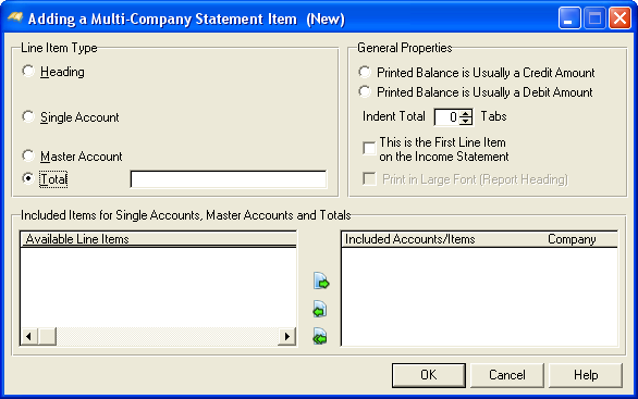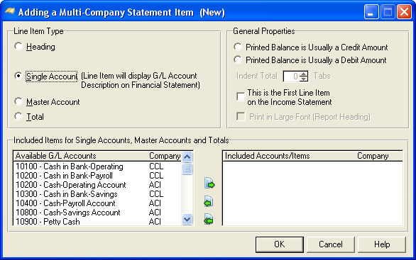 When the Add or Change button is press the following screen comes into view. For more information on Financial Statement Line Items, see Adding or Changing Financial Statement Line Items.