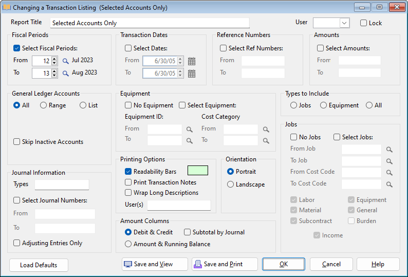 After selecting Transaction Report from the General Ledger Report menu, the following selection screen will come into view.