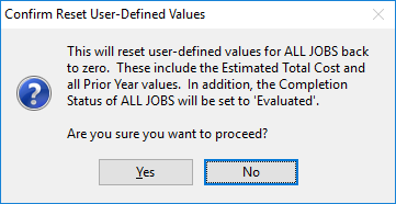 This button will reset the user-defined values for the current job. If the Reset Values button is pressed, the following screen will come into view.