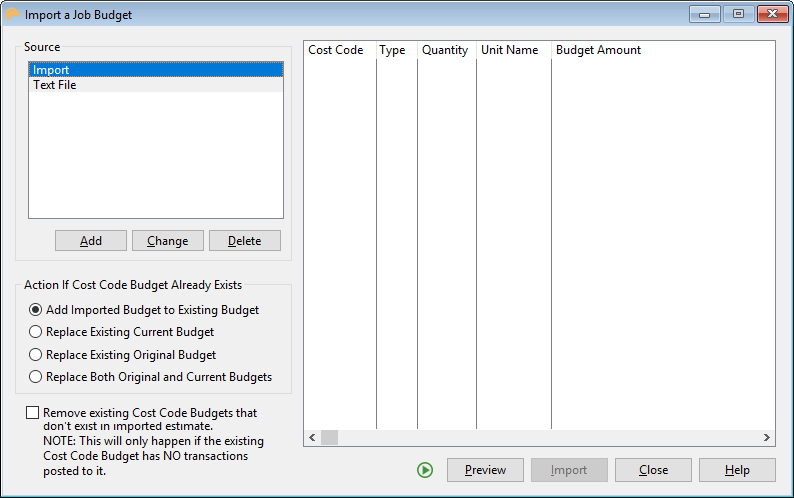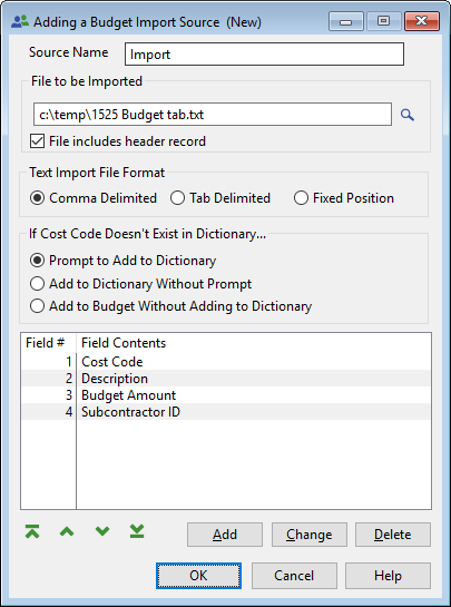 This button is used to take an estimate from a third party estimating program and import it as a job budget. The program can read any text file delimited with commas or tabs.