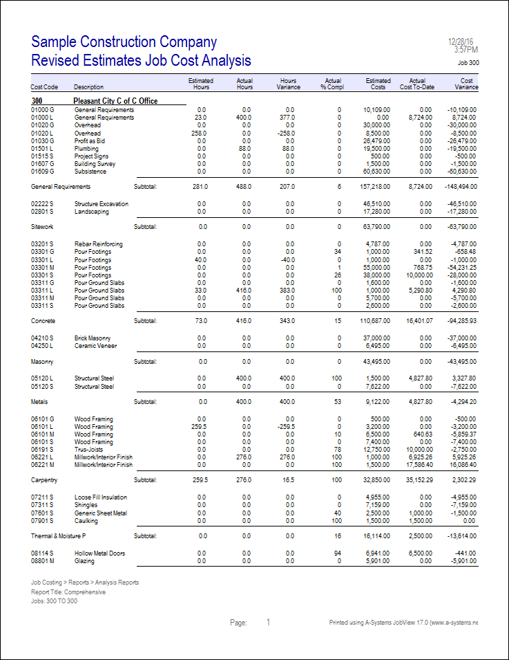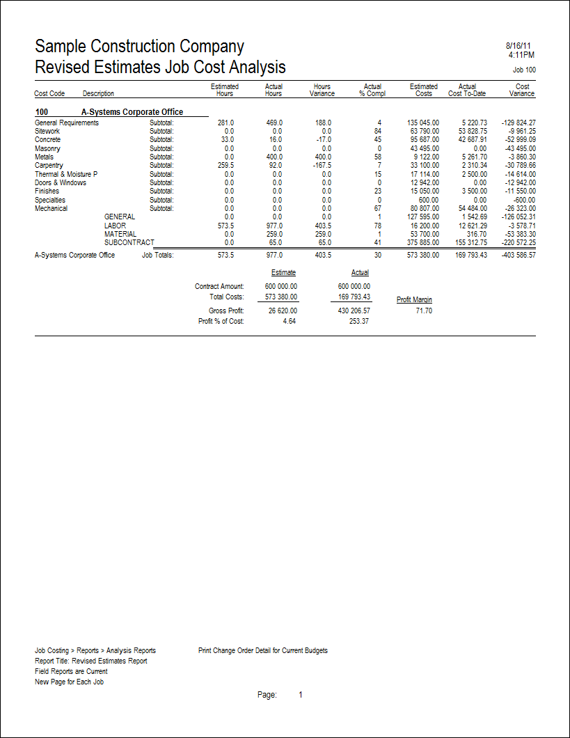 Report Sample - Revised Estimates Job Analysis Report (Detail Format)
