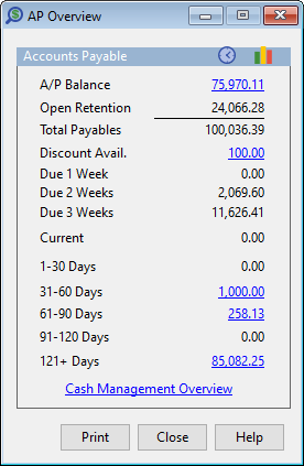 The Accounts Payable Overview option on the Overview menu allows the user to quickly view Accounts Payable balances from the Company Overview screen. Click on Accounts Payable Overview on the Overview menu and the following screen will come into view.