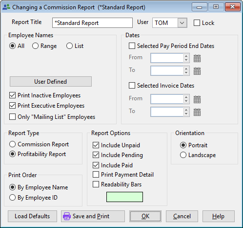 Choose either the standard Commission Report or the Profitability Report. The Profitability report compares the employee cost (Gross Pay and Burden) with the amount of revenue the employee generated (the Commissionable Amount on invoices commissionable to this employee) to come up with an employee profitability figure.