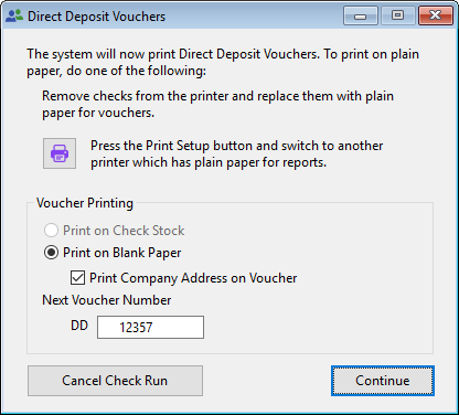 Select the type of paper on which to print the voucher(s). If Blank Paper is selected, the user is prompted to enter the Next Voucher Number. Also, the user can indicate whether the Company Address should be printed on each voucher. Press Continue and the voucher(s) will be printed.