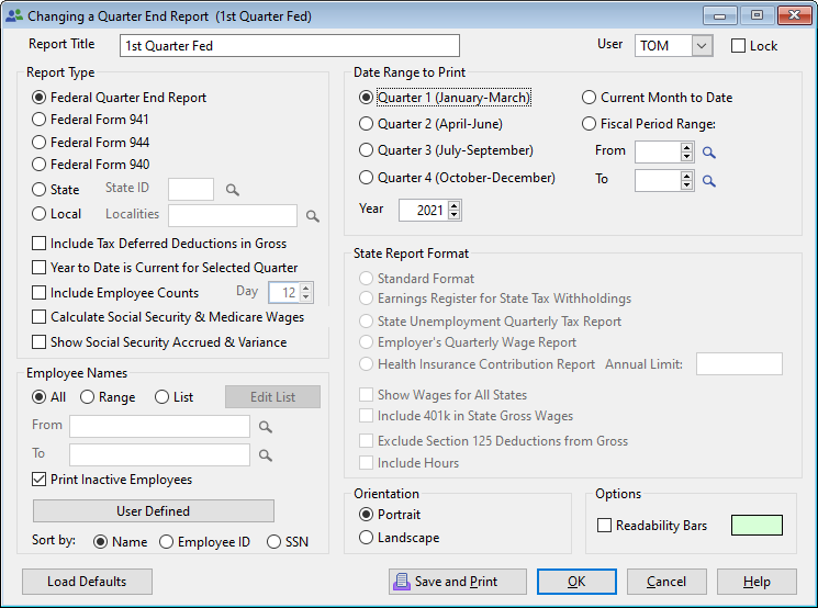 Check this radio button to print a Federal Form 941 Report.