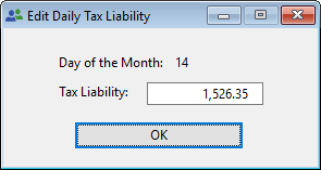 If the tax liability dollar amount for a particular day needs to be added or changed, press this button. The following screen comes into view.