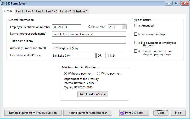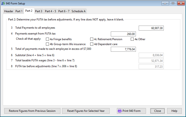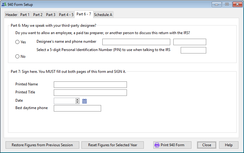 The Federal Form 940 must be completed annually. All the information necessary to print a 940 Form will be entered through the tabs on this screen. The accounting system will automatically enter the information and complete the form based on information taken from the Payroll module.