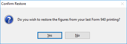 This option allows for the restoration of the figures from the last printed 940 Form. When this button is pressed, the following message appears.