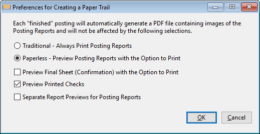 Select this option to use the Paperless setting with the option to print posting reports from the Report Preview screen.