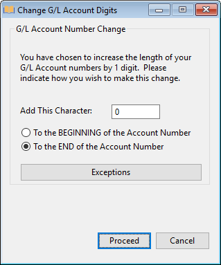 If this radio button is selected, the character specified in the previous field will be added to the beginning of all G/L account numbers.