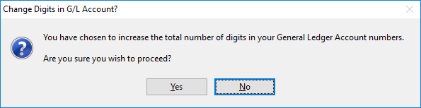 After the total number of digits in the General Ledger Account numbers have been increased and the OK button pressed, the following message will come into view.