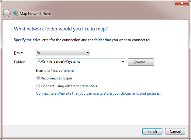 On each client machine, create a map to the file server’s shared resource (\\AS_File_Server\ASystems). For our explanation, we will use drive V. If the server will also be used as a client machine, running Visual Bookkeeper on a regular basis, map the shared resource there as well.