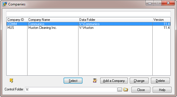On all the remaining client machines, go to the Login window and click the Browse button. Change the Control Folder setting from C:\ASystems to V: and restart the program. When you return to this window you will see the correct list of companies in the company list box. This list of companies is stored in the Company.dat file in the Control Folder. Since all client computers are pointing to V: as the Control Folder, they all see the same list of companies.